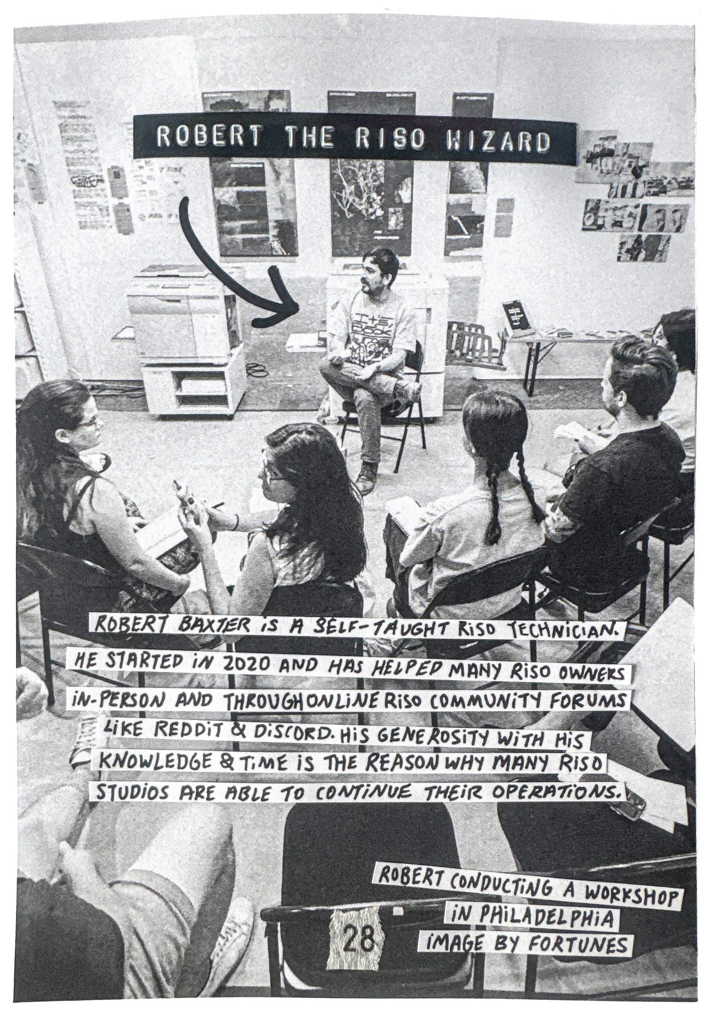 I think of it like this: there’s a series of things needed to be done to run the risos and keep them running—that’s just a list of tasks. If you take that list, you can split up the components of it into different responsibilities that different people can hold—then so long as people are only doing tasks they know how to do, they can run the riso safely and with confidence, and there’s always someone who can do all the various things the machine needs.
